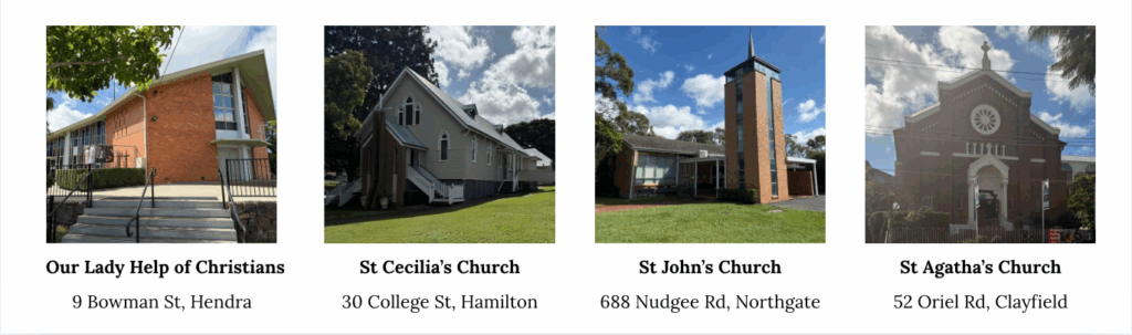 The parishes are connected to St Cecilia’s Kindergarten, St Agatha’s Primary, and Our Lady Help of Christians Primary. If you are a member of the parish and would like a school reference, please click here.