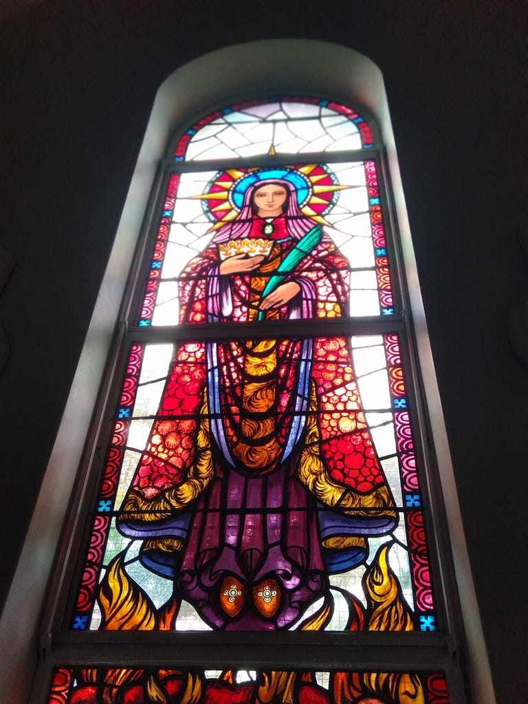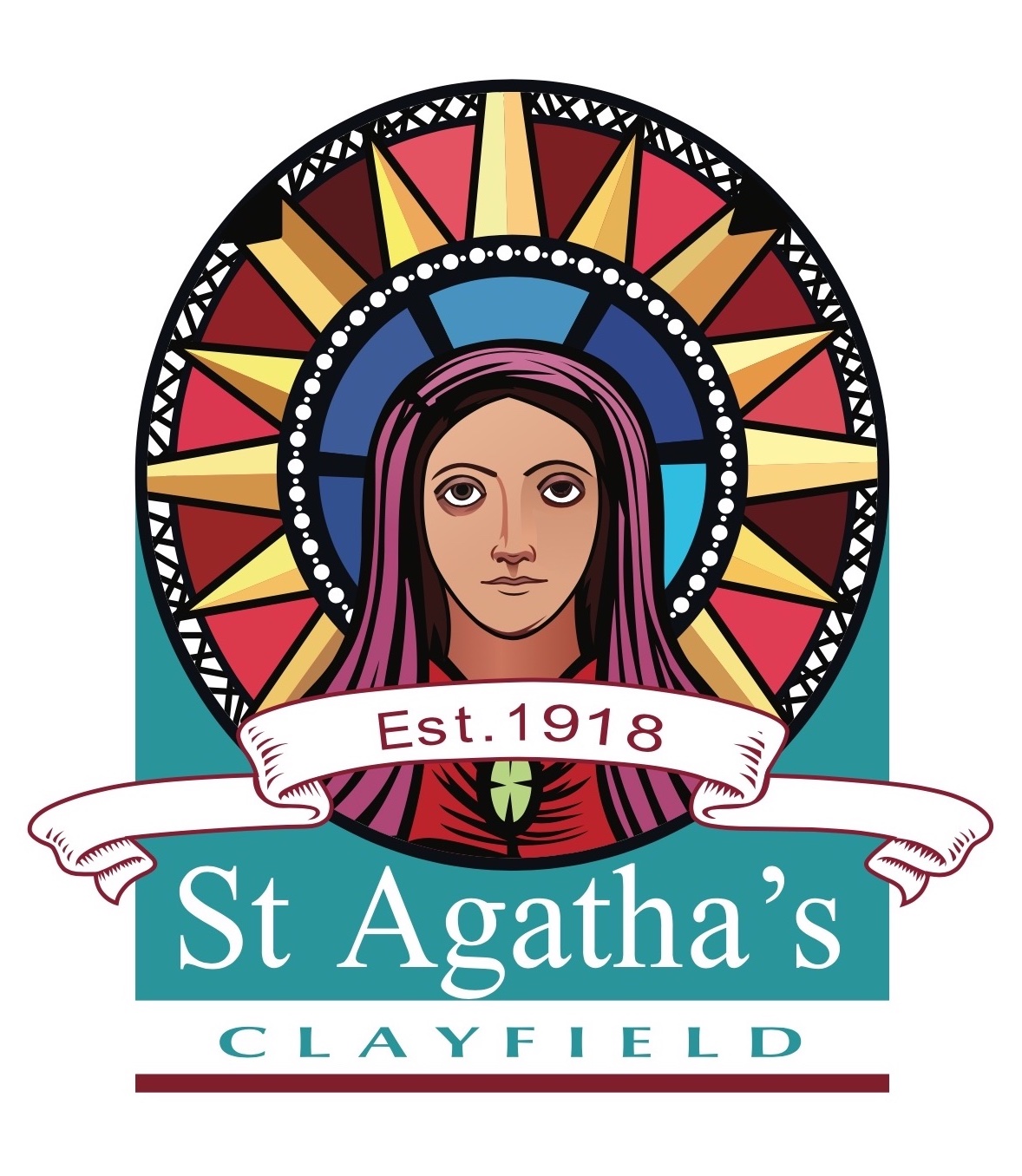 St Agatha, the patron saint of the parish, is depicted in a stained glass window to the left side of the church’s entrance. As a virgin martyr, she holds the martyr’s palm and crown, with flames around her feet symbolising her intercession during the eruption of Mt Etna which resulted in the town being saved. Famed for the virtues of chastity, resilience under torture, and a bold and courageous faith, she is one of seven women martyrs named in the First Eucharistic Prayer during mass. The parish logo is taken from this stained glass representation of St Agatha.