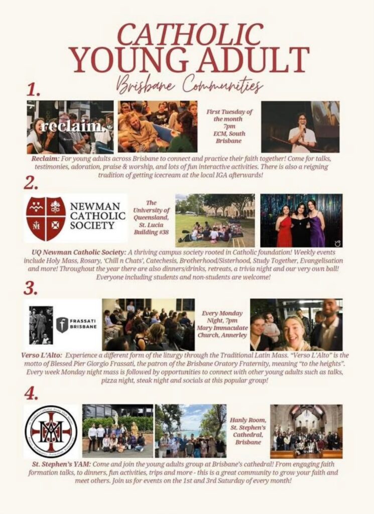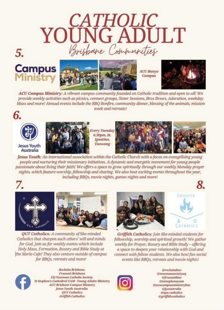 There are several ministries within the Archdiocese of Brisbane for youth and young adults, including: